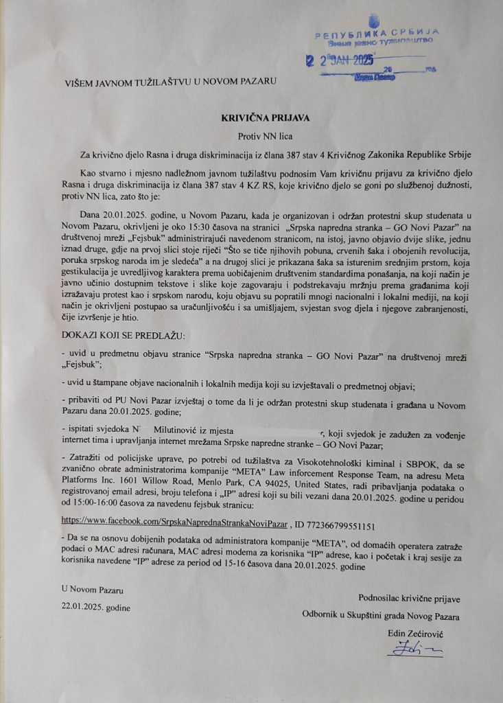 Građanski pokret Sandžaka (GPS) je saopštio da je predsjednik te stranke “povodom sramnog čina postavljanja fotografije sa istaknutim srednjim prstom, na fejsbuk stranici Gradskog odbora Srpske napredne stranke (SNS) u Novom Pazaru, i prateće tekstualne poruke”, danas, Višem javnom tužilaštvu u Novom Pazaru, predao krivičnu prijavu protiv NN lica, za krivično djelo „Rasna i druga diskriminacija“ iz člana 387 Krivičnog zakona, za koje je tužilaštvo obavezno da vodi postupak po službenoj dužnosti.