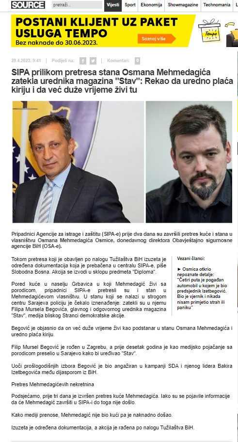 „Pored kuće u naselju Grbavica u koji Mehmedagić živi sa porodicom, pripadnici SIPA-e pretresli su i stan u Mehmedagićevom vlasništvu. U stanu koji se nalazi u strogom centru Sarajeva policiju je čekalo iznenađenje: zatekli su u njemu Filipa Mursela Begovića, glavnog i odgovornog urednika magazina ‘Stav’, glasila Stranke demokratske akcije! Begović je objasnio da on već duže vrijeme živi kao podstanar u stanu Osmana Mehmedagića i uredno plaća kiriju.“