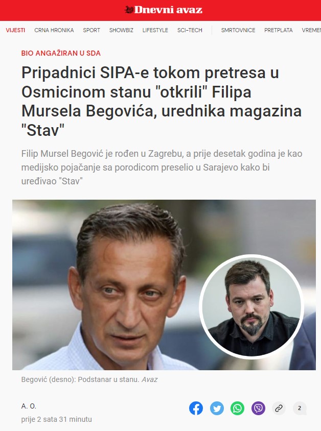 Glavni urednik sarajevskog sedmičnika “STAV”, novinar i publicista, Filip Mursel Begović demantovao je navode koje je portal “Slobodne Bosne” objavio, a ostali prenijeli, kao potpuno neistinitu i netačnu klevetu da ga je SIPA prilikom pretresa stana Osmana Mehmedagića Osmice (bivšeg tjelohranitelja rahmetli Alije Izetbegovića i direktora Obavještajno-sigurnosne agencije BiH), u centru Sarajeva zatekla kao podstanara.