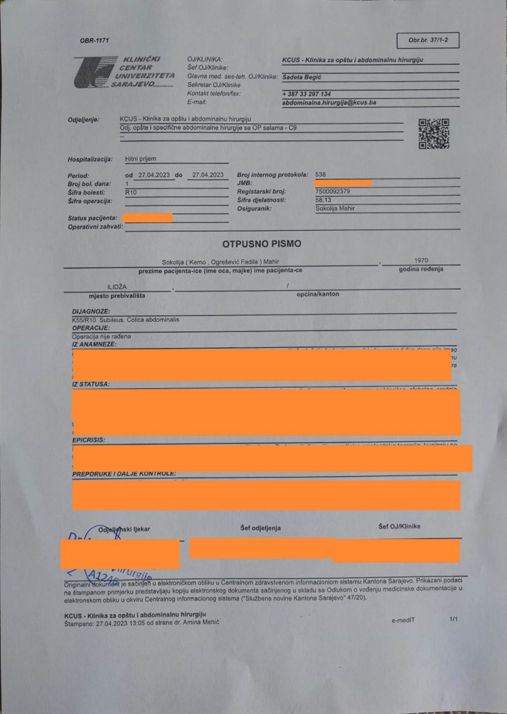 Novinar Mahir Sokolija je, uz objavu Otpusnog pisma sa Klinike za opšu i abdominalnu hirurgiju KCUS objavio: